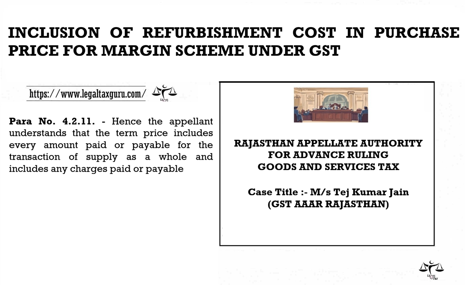 Para No. 4.4.10. – That hence when applicant would incur the cost towards the procurement it would pay GST (as maybe applicable) and may also pay GST while incurring the refurbishment cost, if applicable. However, since ITC is not available under the given notification hence if deduction of refurbishment expenses is not given then it shall lead to a situation of double taxation and hence would defeat the whole purpose of the notification as such.