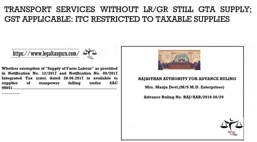 A REGISTERED GOODS TRANSPORT AGENCY (GTA) LIABLE TO GST: INPUT CREDIT APPORTIONBLE UNDER RULE 42 FOR MIXED SUPPLIESRAJASTHAN AUTHORITY FOR ADVANCE RULINGGOODS AND SERVICES TAXCase Title- M/s K M Trans Logistics Private Limited(GST AAR RAJASTHAN)Advance Ruling No. RAJ/AAR/2019-20/19Date of Judgment/Order- 29th August 2019IMPORTANT PARAGRAPHSRULING
