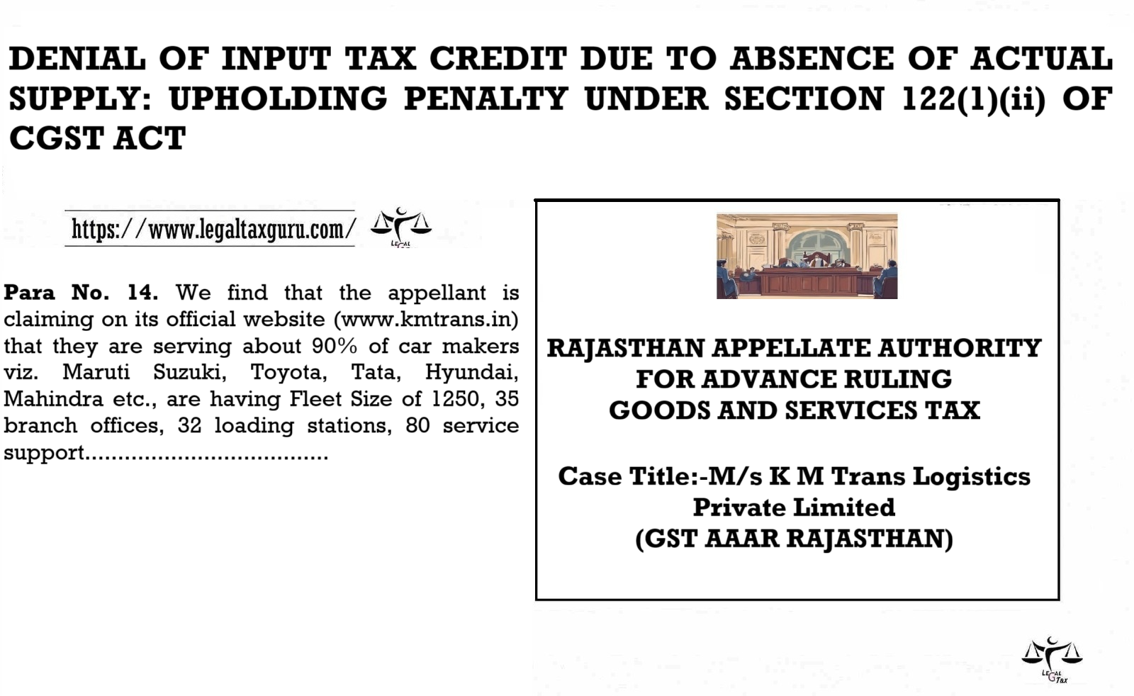 Para No. 14. We find that the appellant is claiming on its official website (www.kmtrans.in) that they are serving about 90% of car makers viz. Maruti Suzuki, Toyota, Tata, Hyundai, Mahindra etc., are having Fleet Size of 1250, 35 branch offices, 32 loading stations, 80 service support. From this, it is clear that the appellant transporter is not from unorganized sector of transporters and has a vast network all over India for transportation of goods. They are providing services to various manufacturers of motor vehicles involving transportation of motor vehicles which are carried from the factory to the various cities in India where the authorised dealers are located. In this process of transportation, two types of services either by way of activity described as goods transport agency services or by way of rental services of transport vehicles can be provided. In the instant case of the appellant, if the lien of the goods is transferred and the appellant becomes responsible for the goods till its safe delivery to the consignee, the services will be classifiable as goods transport agency services and issuance of consignment note or its non-issuance does not make any difference so far as the nature of the activity carried out by them is concerned. Mere non-issuance of the consignment note in such cases does not make them entitled for exemption from payment of GST. However, if the vehicles are provided to the client on rental for use as per their requirement, the services will be classifiable as rental services of transport vehicles’.