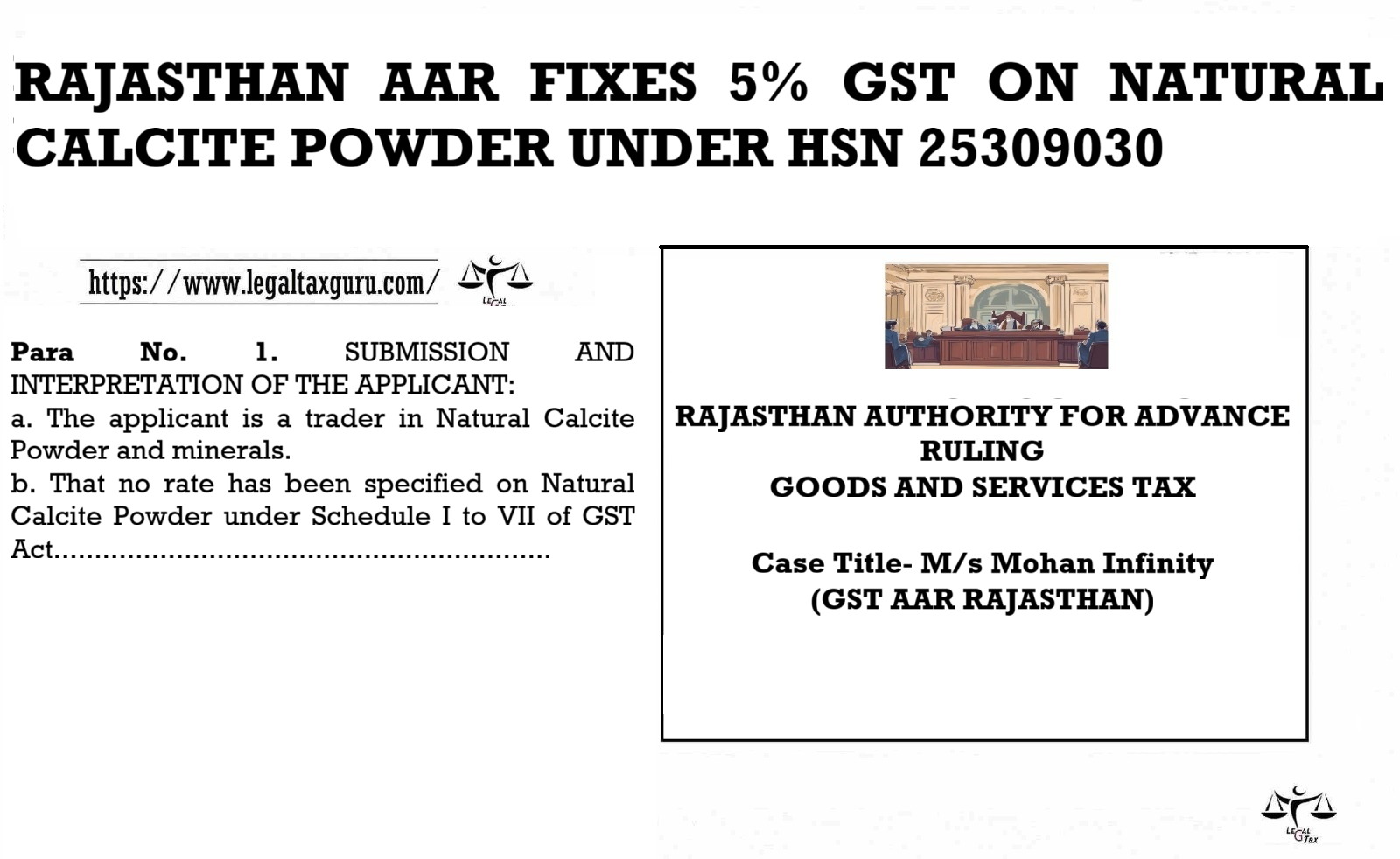 The Natural Calcite Powder is classifiable under HSN Code 25309030 and attracts GST @ 5% (CGST @ 2.5% and SGST @ 2.5%).