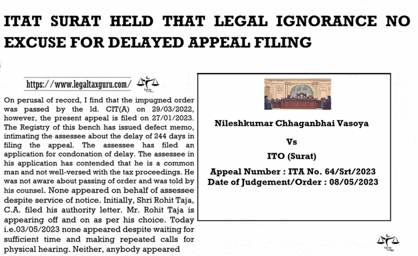 ITAT SURAT HELD THAT LEGAL IGNORANCE NO EXCUSE FORDELAYED APPEAL FILING