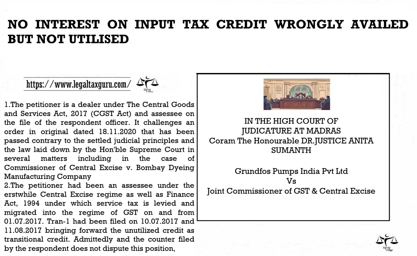 1.The petitioner is a dealer under The Central Goods and Services Act, 2017 (CGST Act) and assessee on the file of the respondent officer. It challenges an order in original dated 18.11.2020 that has been passed contrary to the settled judicial principles and the law laid down by the Hon’ble Supreme Court in several matters including in the case of Commissioner of Central Excise v. Bombay Dyeing Manufacturing Company.