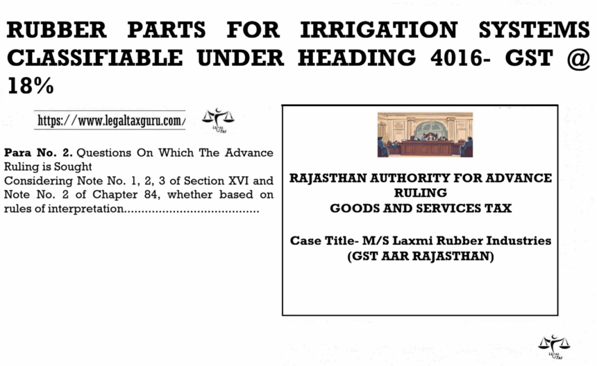 Considering Note No. 1, 2, 3 of Section XVI and Note No. 2 of Chapter 84, whether based on rules of interpretation of HS codes, the items made of vulcanized rubber like Rubber Ring/ GASKET/ Seal, Rubber Foot Batten Washer and Rubber Grommets falling under the heading 4016 are taxable as specific rubber items having a GST rate of 18% or as components of sprinkler/ Drip irrigation system having a tax rate of 12% under heading 84249000. It is pertinent to note that these items are designed and shaped that these can be used only in sprinkler/ drip irrigation equipment and have no other use.