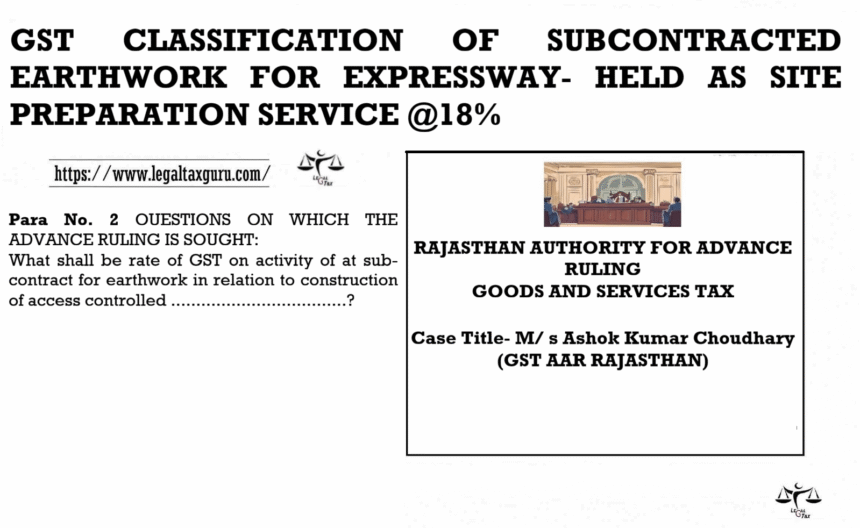 GST CLASSIFICATION OF SUBCONTRACTED EARTHWORK FOR EXPRESSWAY- HELD AS SITE PREPARATION SERVICE @18%RAJASTHAN AUTHORITY FOR ADVANCE RULINGGOODS AND SERVICES TAXCase Title- M/s Ashok Kumar Choudhary(GST AAR RAJASTHAN)Advance Ruling No. RAJ/AAR/2019-20/20Date of Judgment/Order- 3rd September 2019IMPORTANT PARAGRAPHSRULING