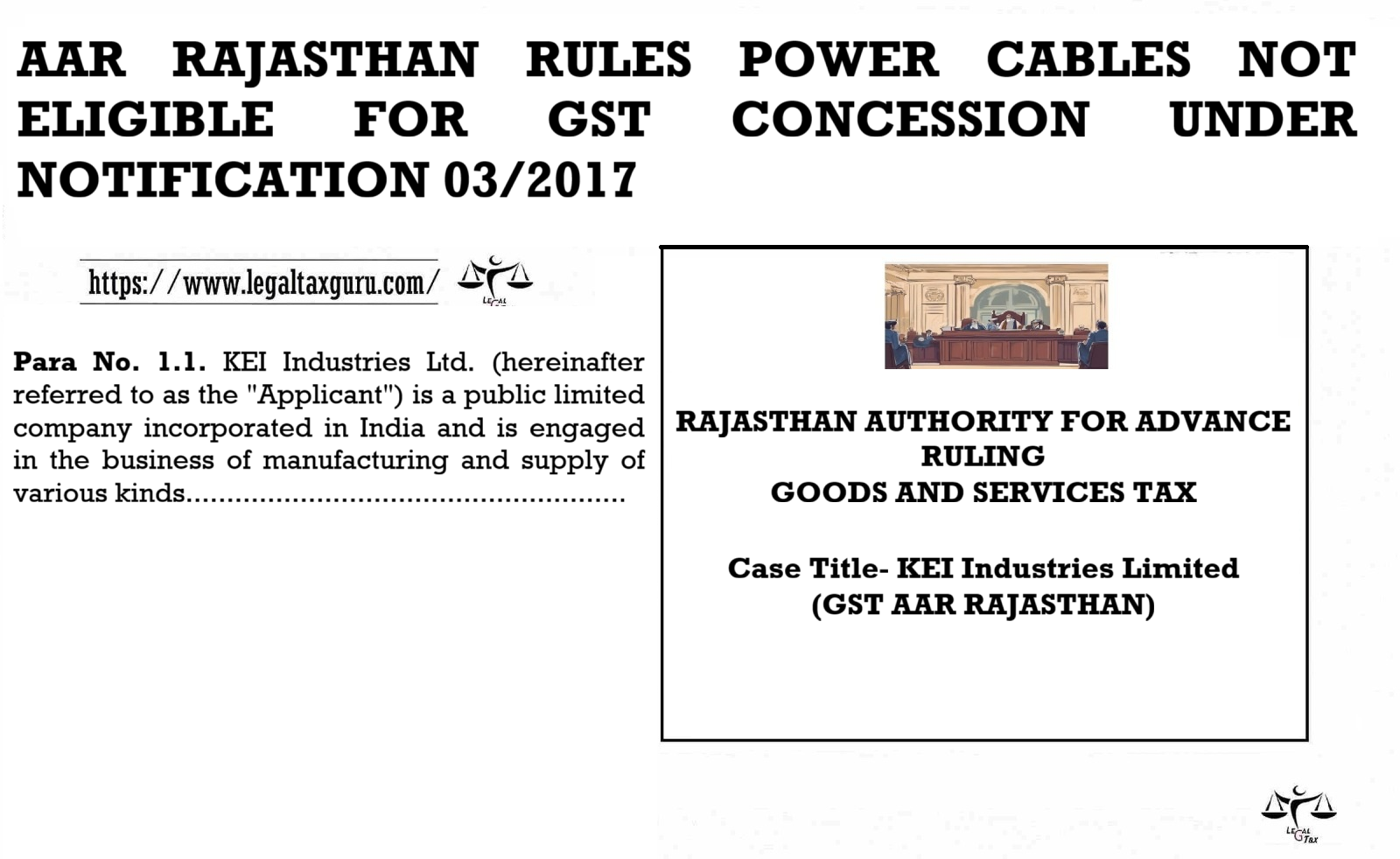 AAR RAJASTHAN RULES POWER CABLES NOT ELIGIBLE FOR GST CONCESSION UNDER NOTIFICATION 03/2017 RAJASTHAN AUTHORITY FOR ADVANCE RULING GOODS AND…
