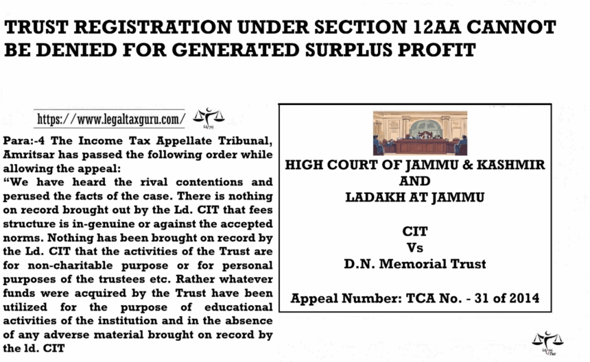 TRUST REGISTRATION UNDER SECTION 12AA CANNOT BE DENIED FOR GENERATED SURPLUS PROFIT